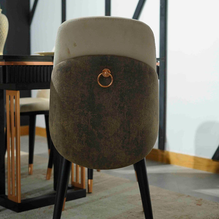 ✅ Stylish Comfort: Upholstered dining chairs with quilted backs and golden-tipped wooden legs for added sophistication.