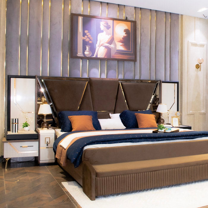 ✅ Premium Design: Velvet upholstered headboard with beveled brown glass and metallic mouldings.